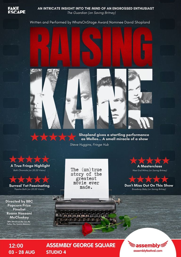 Raising Kane was written, performed and produced by David Shopland and was seen at Edinburgh Fringe Festival 2023 (Assembly Venues), as well as a sold out South West regional tour.